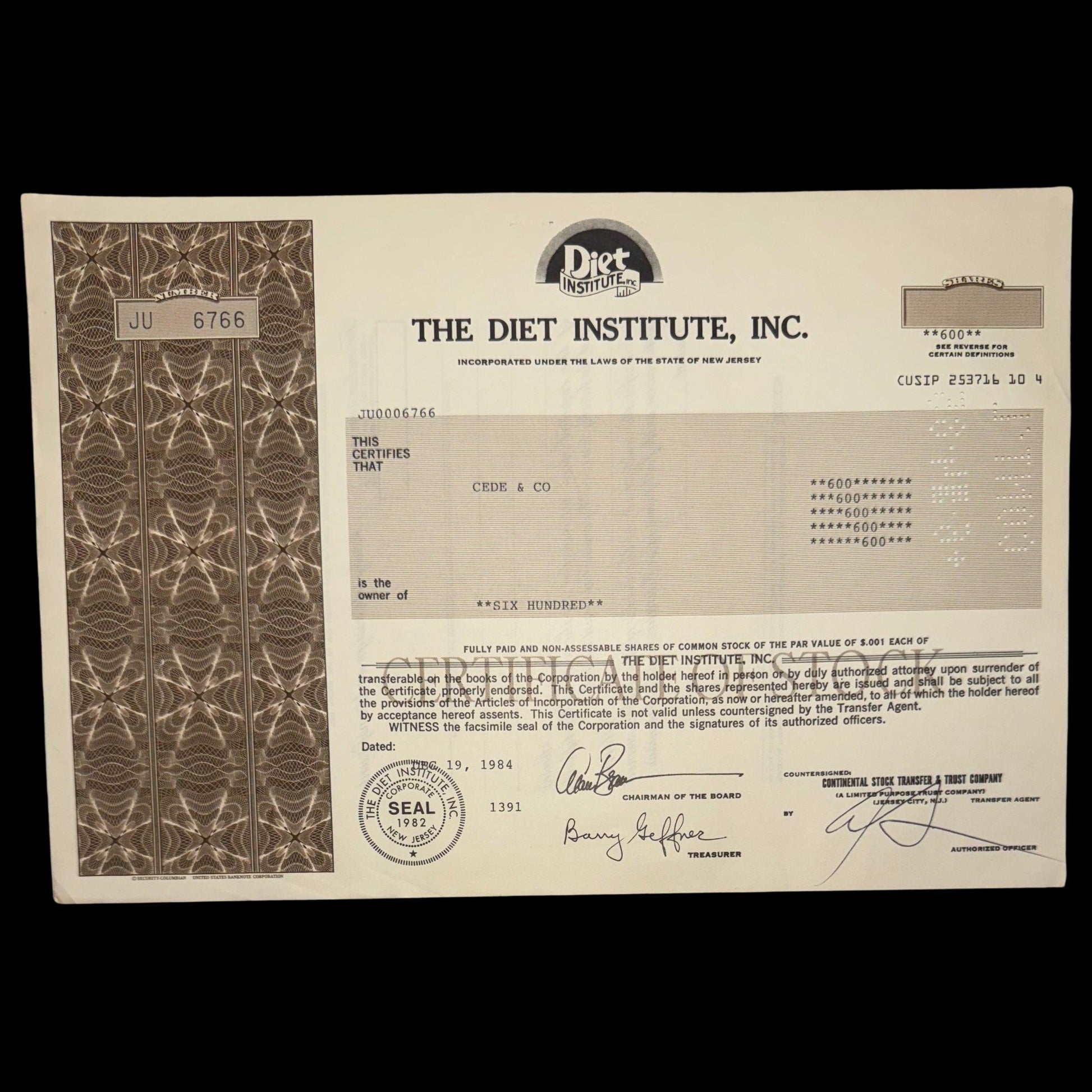 Stock certificate from The Diet Institute that was issued in 1984 and cancelled as seen by punch holes.