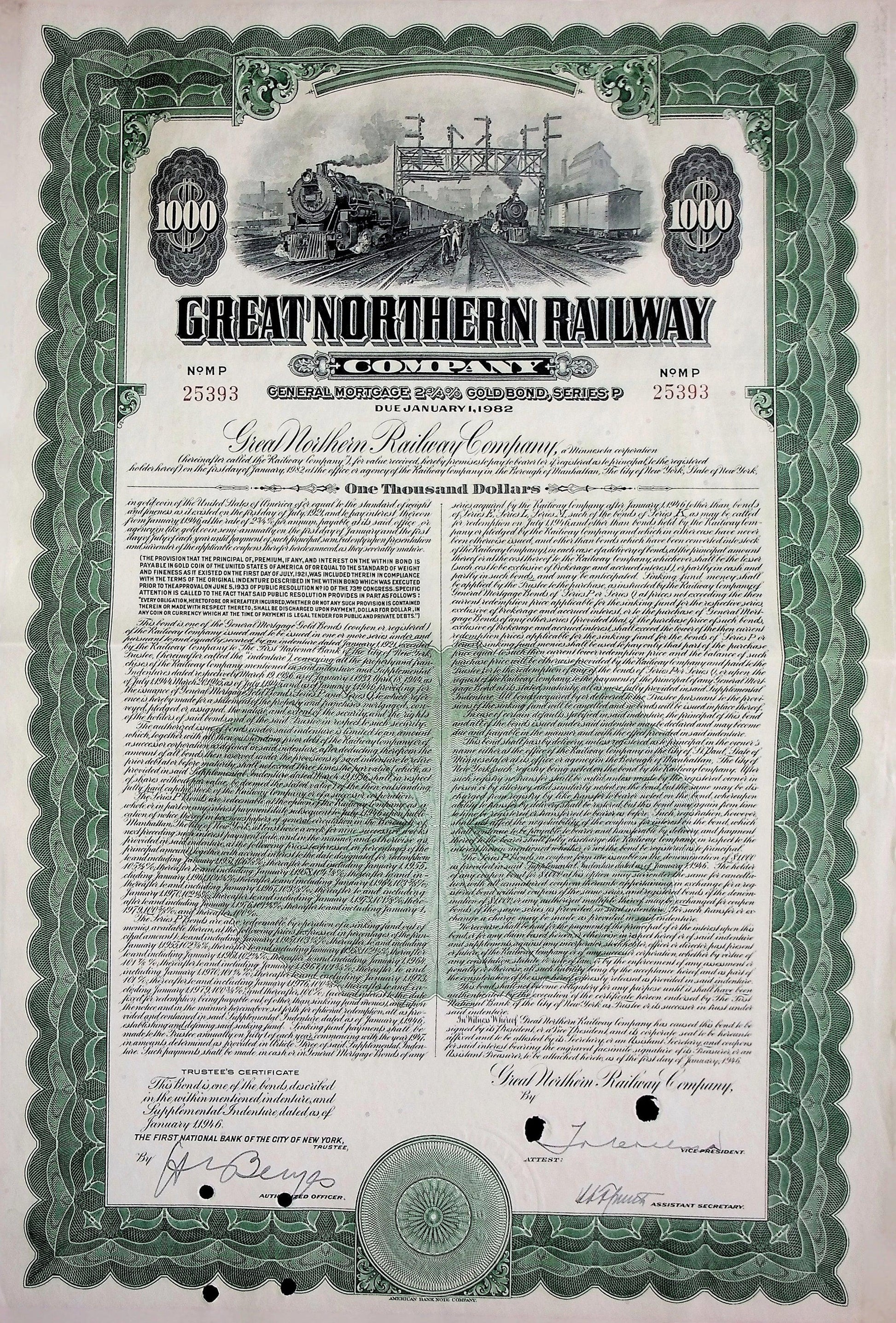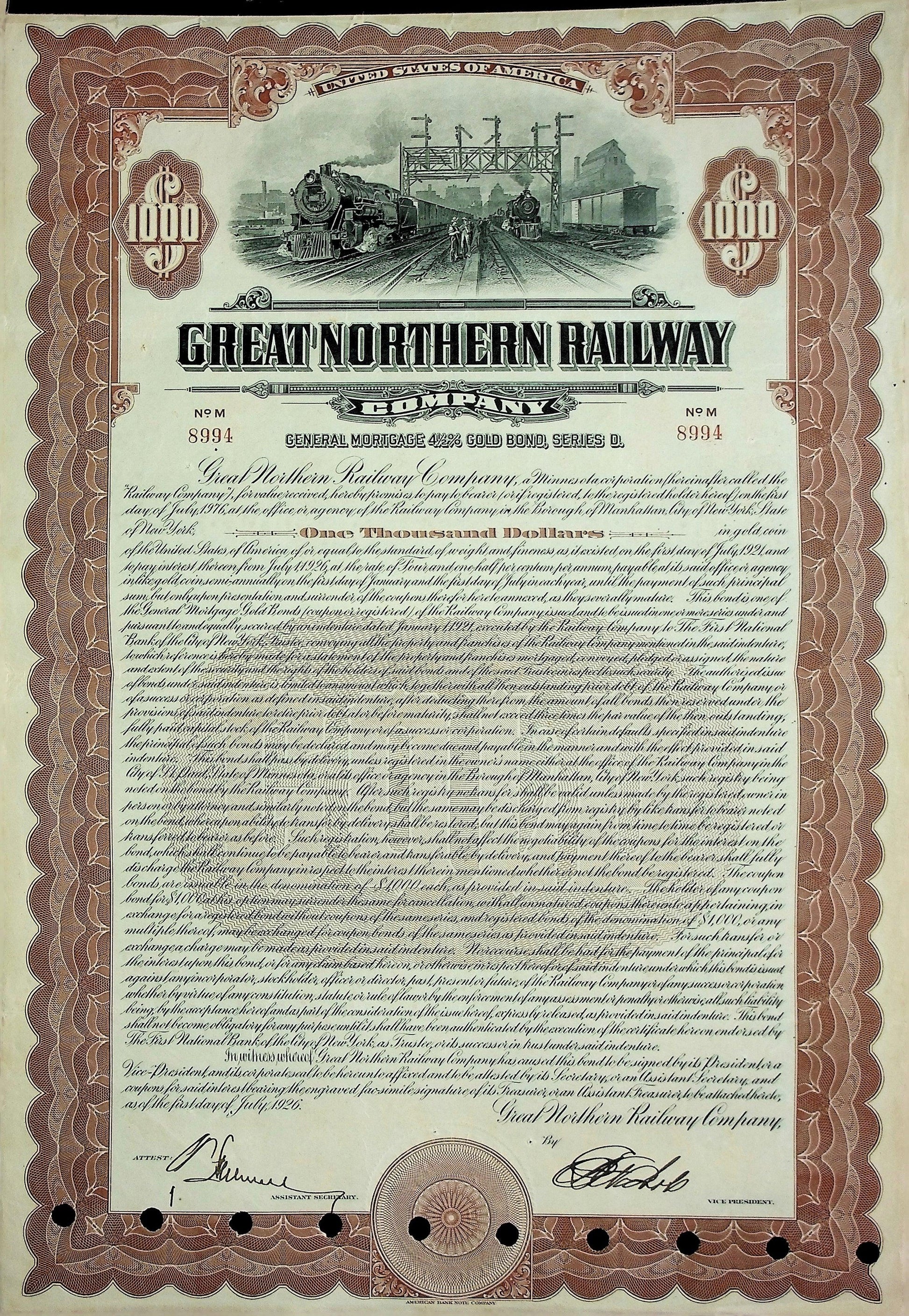 These are beautiful bonds from The Great Northern Railway Company are available in brown or green. Have been issued and cancelled.