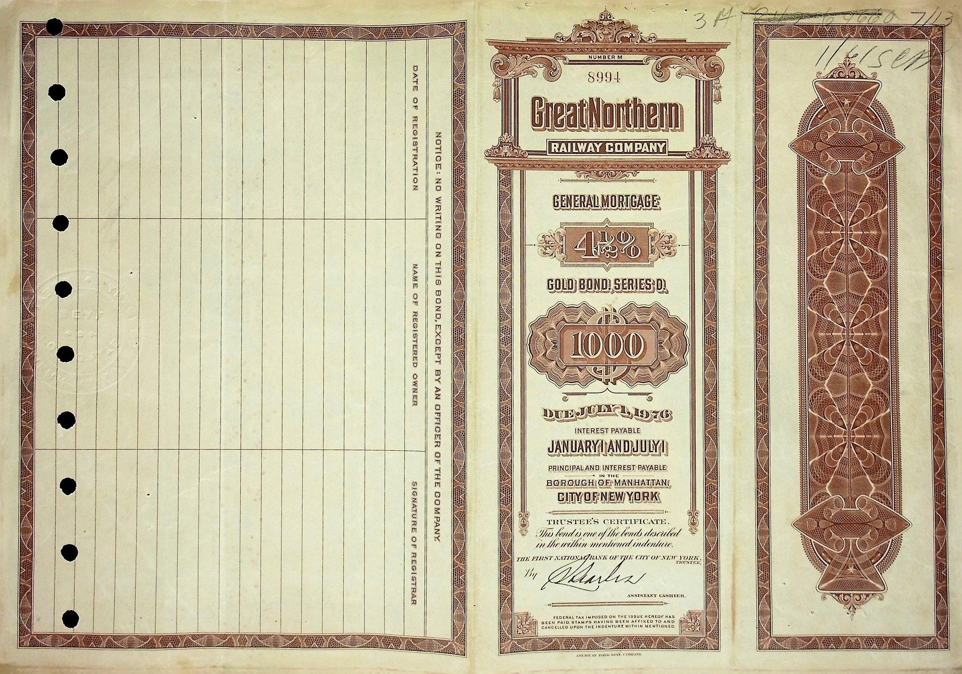 The Great Northern Railway Company Bond Certificate from 1946 (Saint Paul to Seattle)