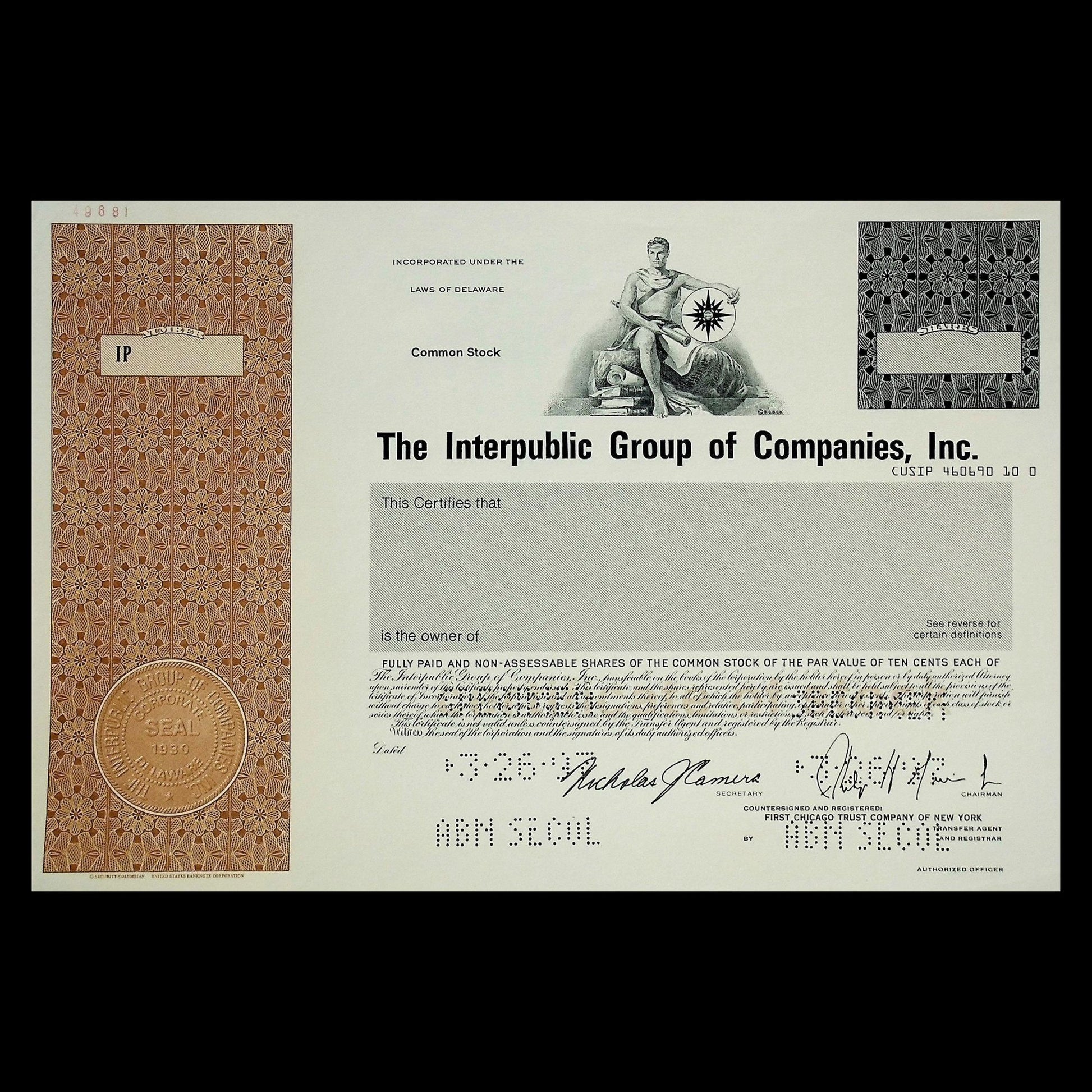 This is a rare stock certificate specimen from the The Interpublic Group of Companies Inc dated 1997. A specimen certificate was used by the printer and company to test the design before issuing certificates to shareholders. Very rare!