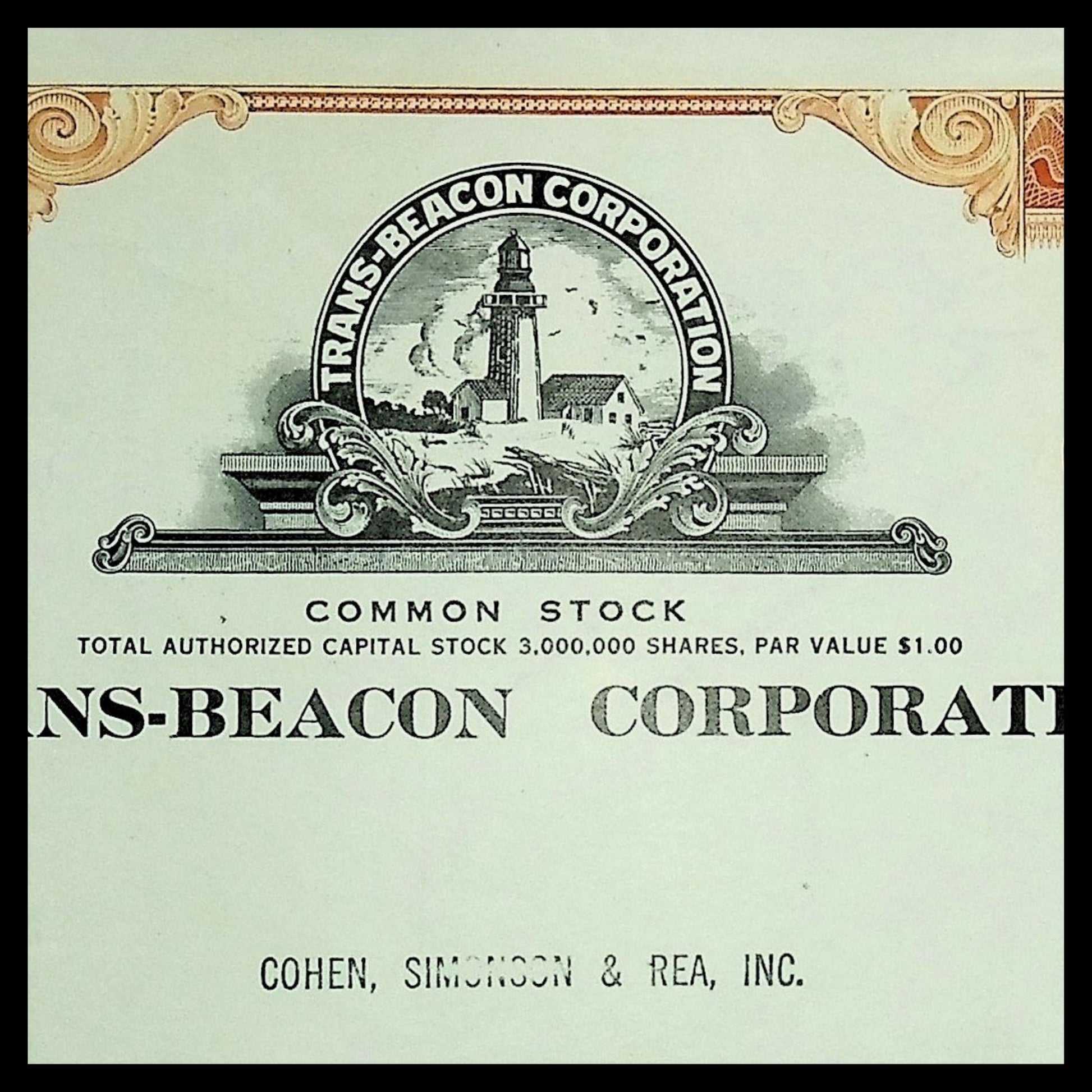 This is an orange stock certificate issued by the Trans-Beacon Corporation in the 1960s. It was issued and later cancelled. Offered as a collectible.