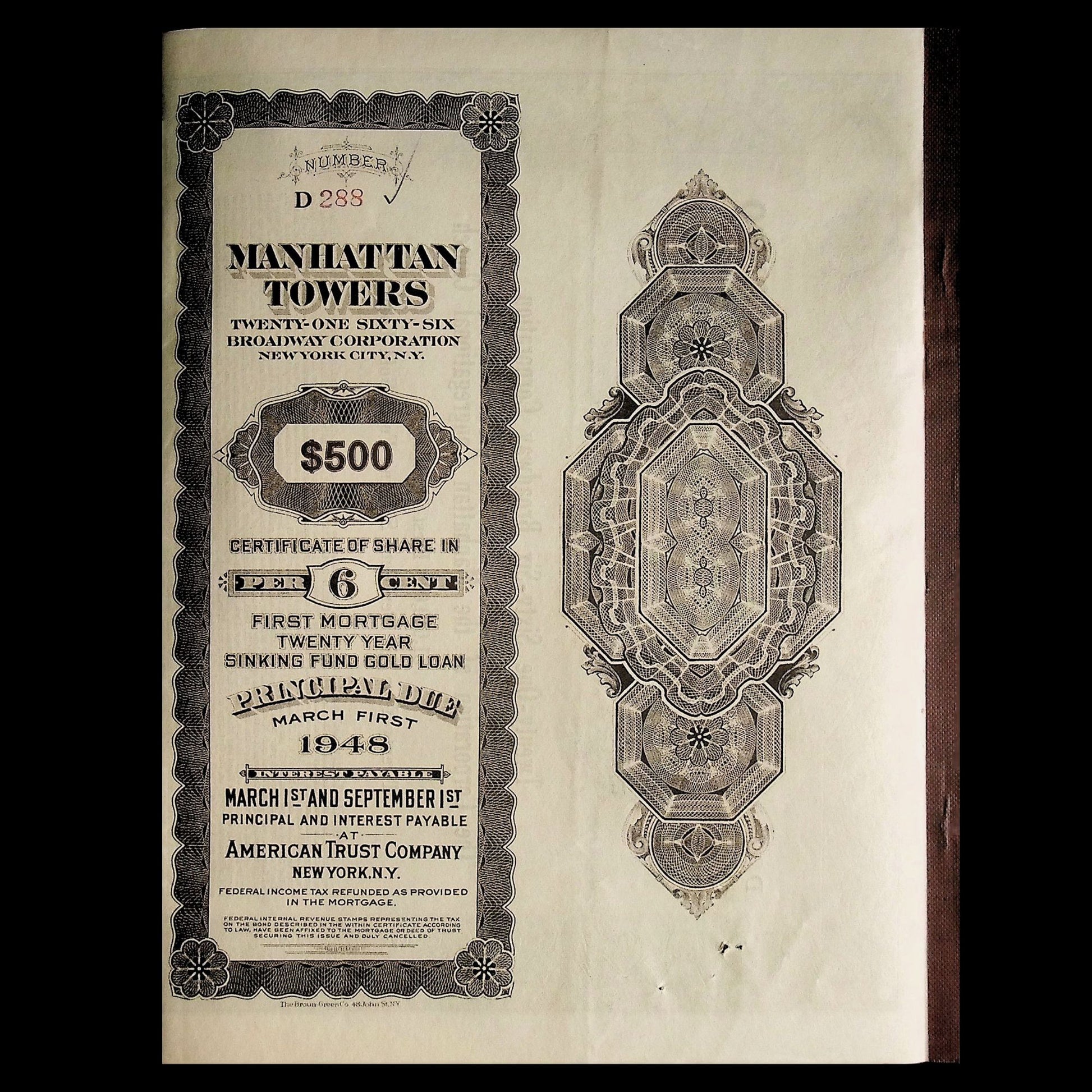 The Twenty-One Sixty-Six Broadway Corporation was created to finance property development at 2166 Broadway in Manhattan, a location formerly occupied by a church. Situated on the Upper West Side near 76th Street, the site exemplifies the transitional wave of institutional-to-commercial real estate conversions in New York during the economic boom of the late 1920s. Bonds like this were secured by rental income or development proceeds and marketed to private investors during a period of speculative optimism just prior to the Great Depression.