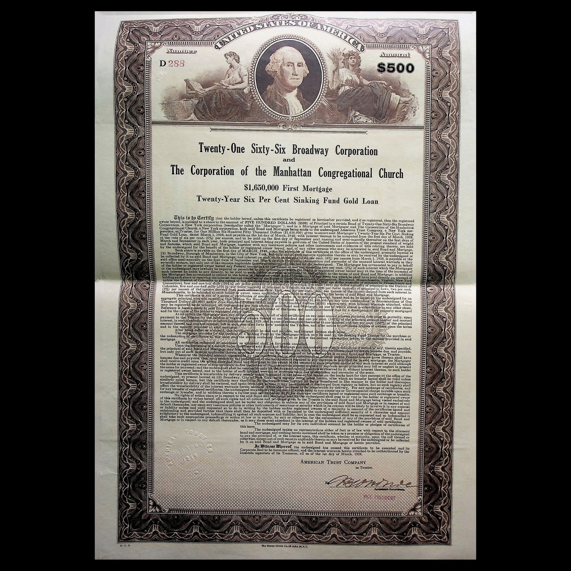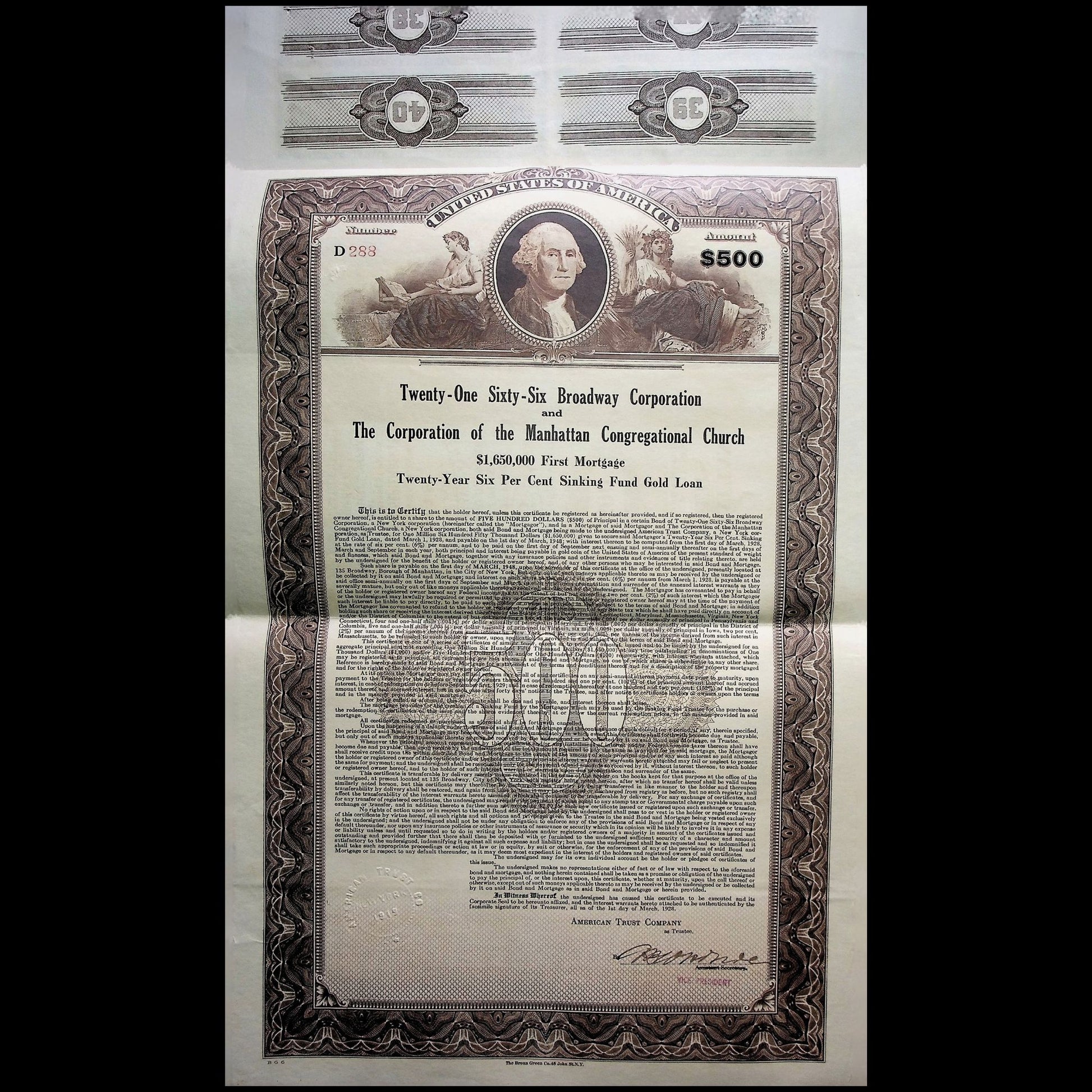 Twenty-One Sixty-Six Broadway Corporation Bond Certificate Manhattan Church with coupons from 1928