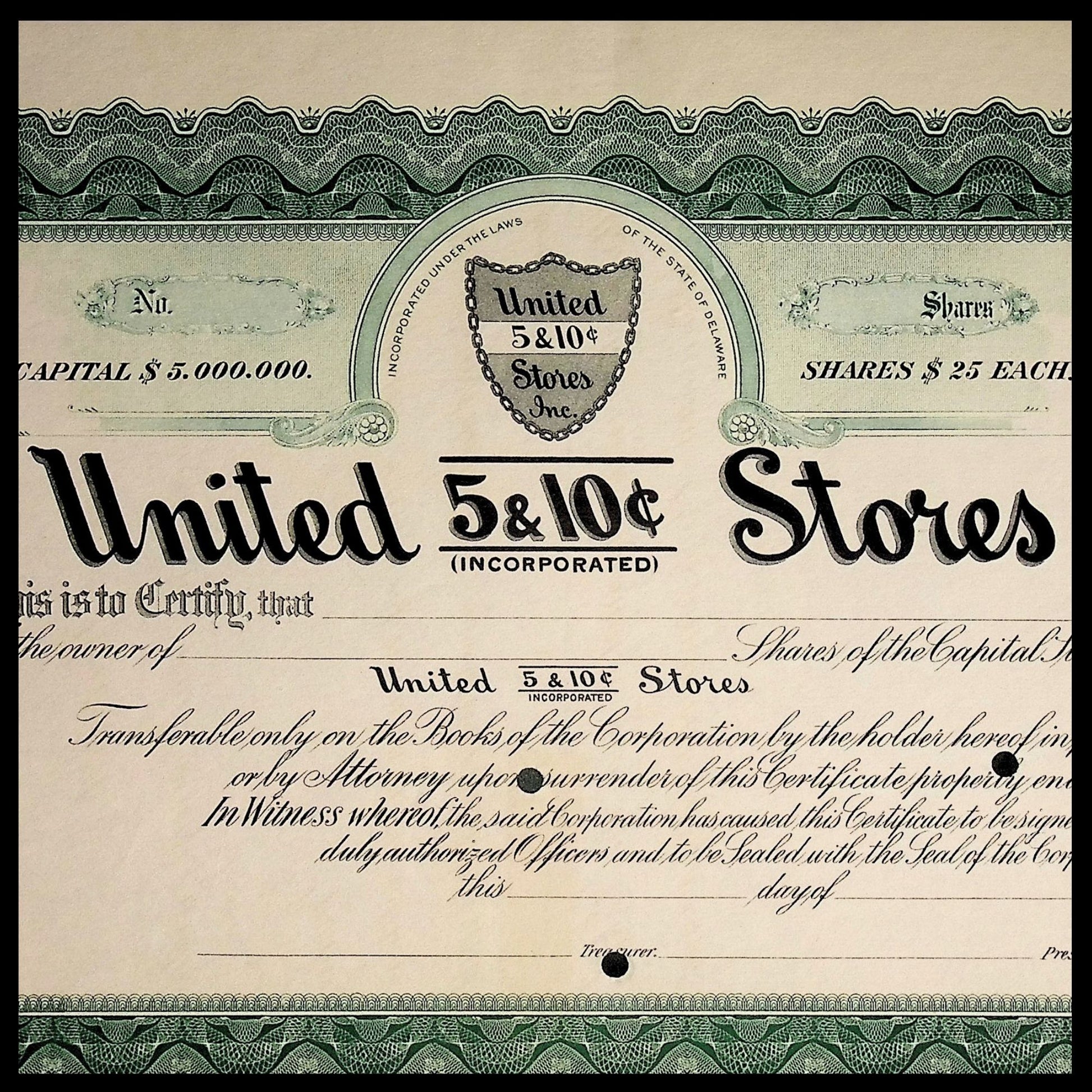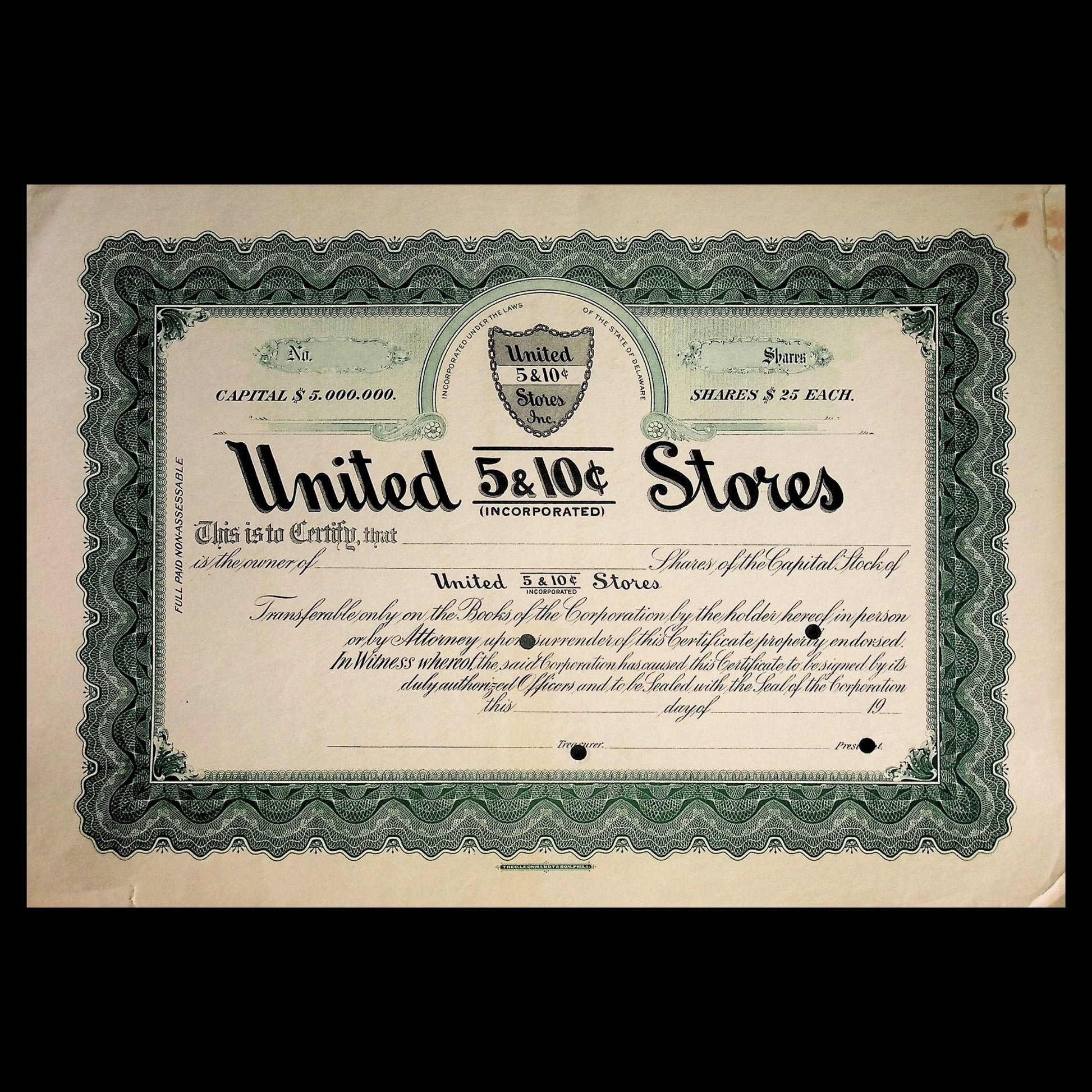 United 5 & 10¢ Stores Stock Certificate early 1900s