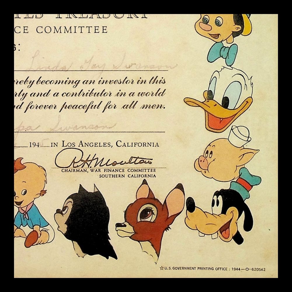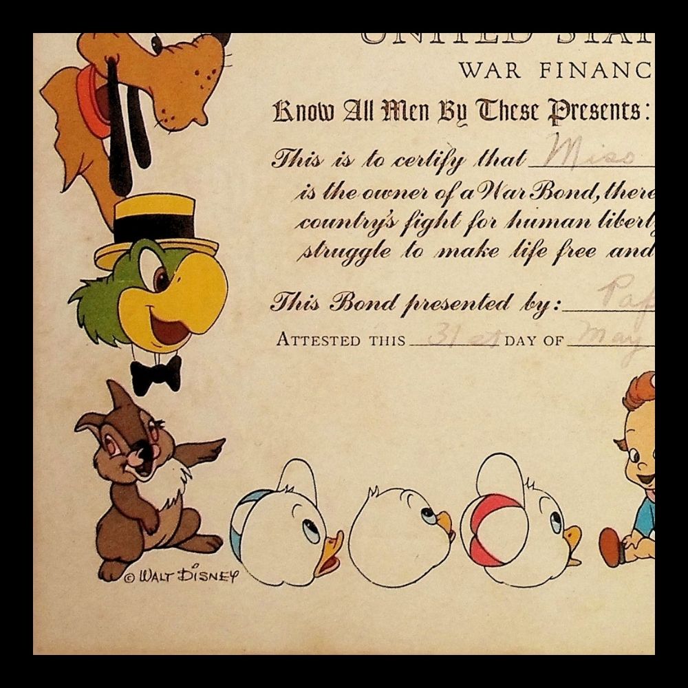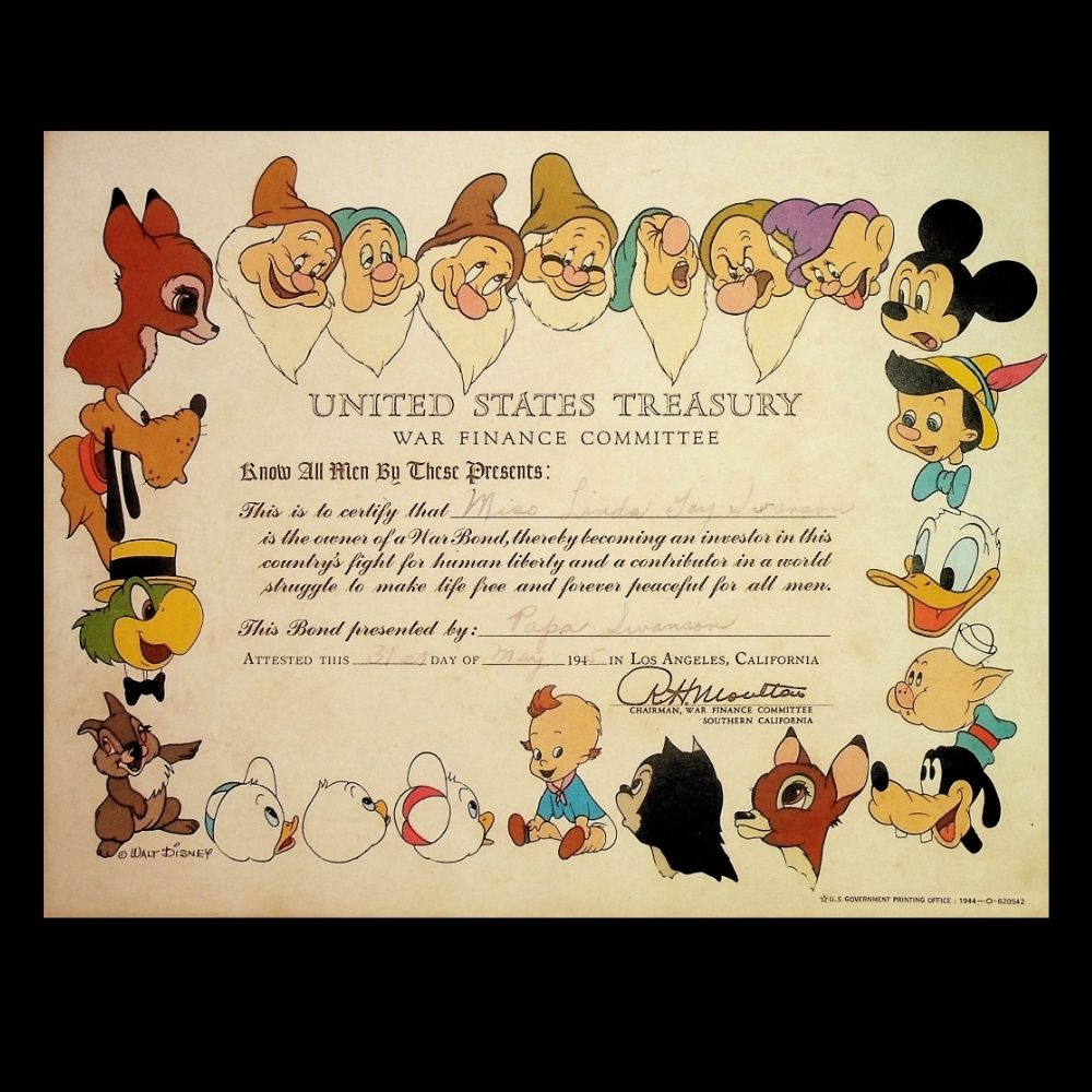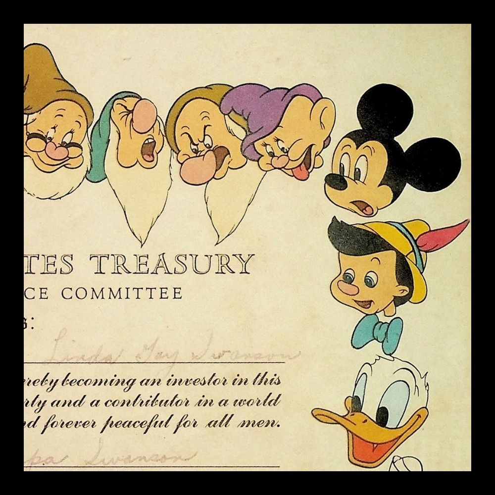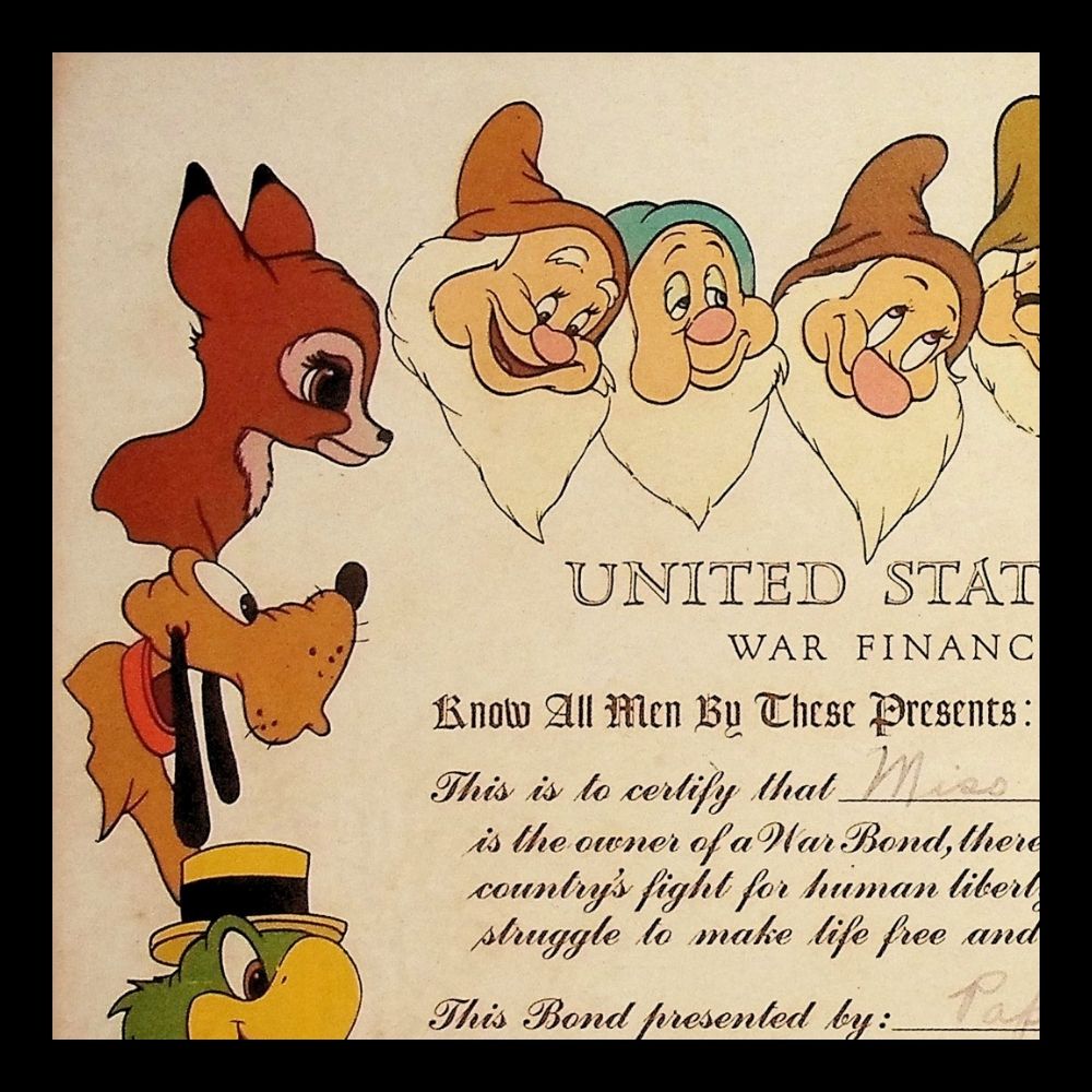 Disney supported the war effort by creating promotional materials to encourage Americans to buy war bonds, contributing to the financial backing of the Allies. This certificate features iconic Disney characters including Mickey Mouse, Pluto, Goofy, the Seven Dwarfs, Pinocchio, Donald Duck, and Bambi