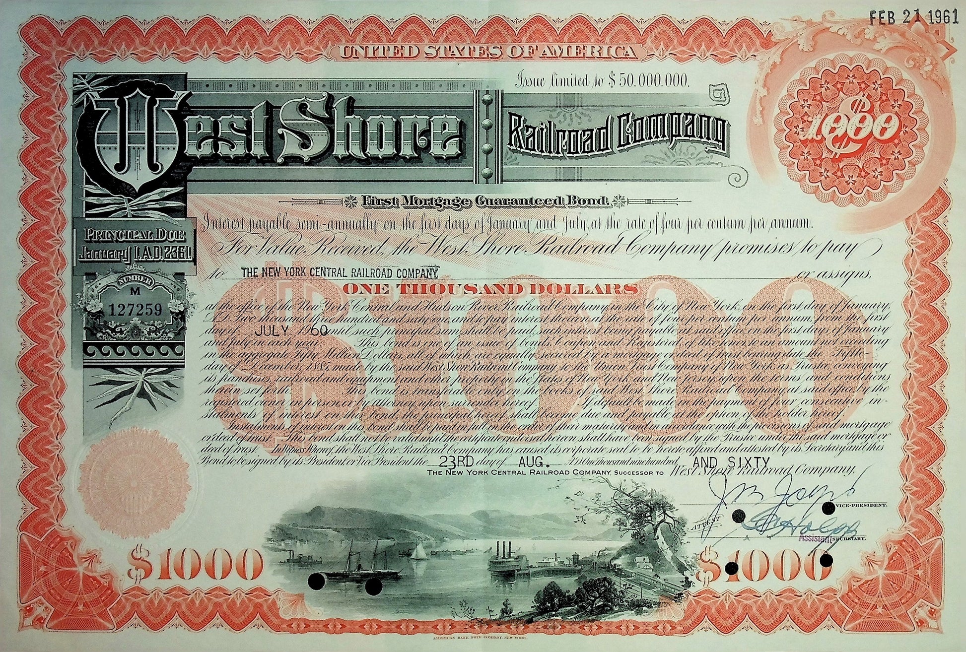 This is a beautiful red/orange bond certificate from the West Shore Railroad company, issued and cancelled from the 1940s. Offered as a collectable.