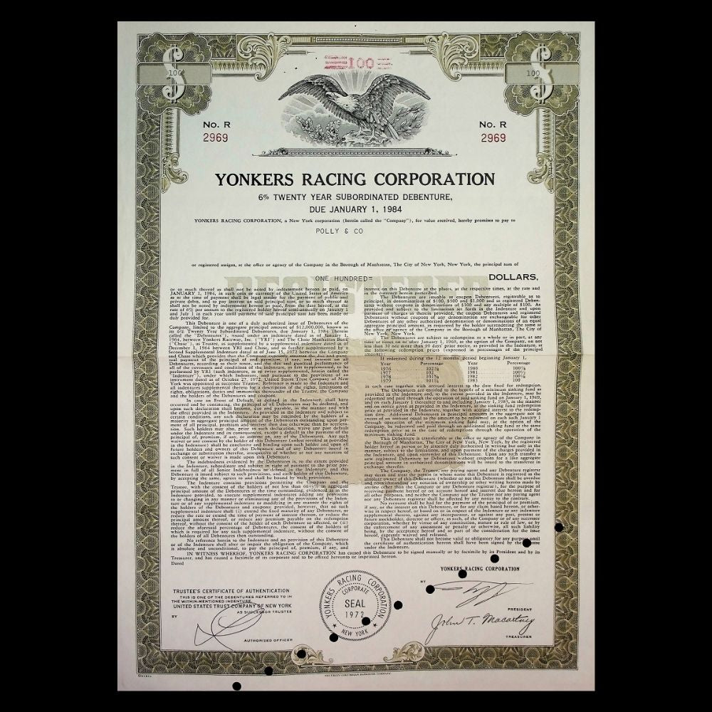 Yonkers Racing Corporation (Empire City Casino) Bond Certificate from 1972