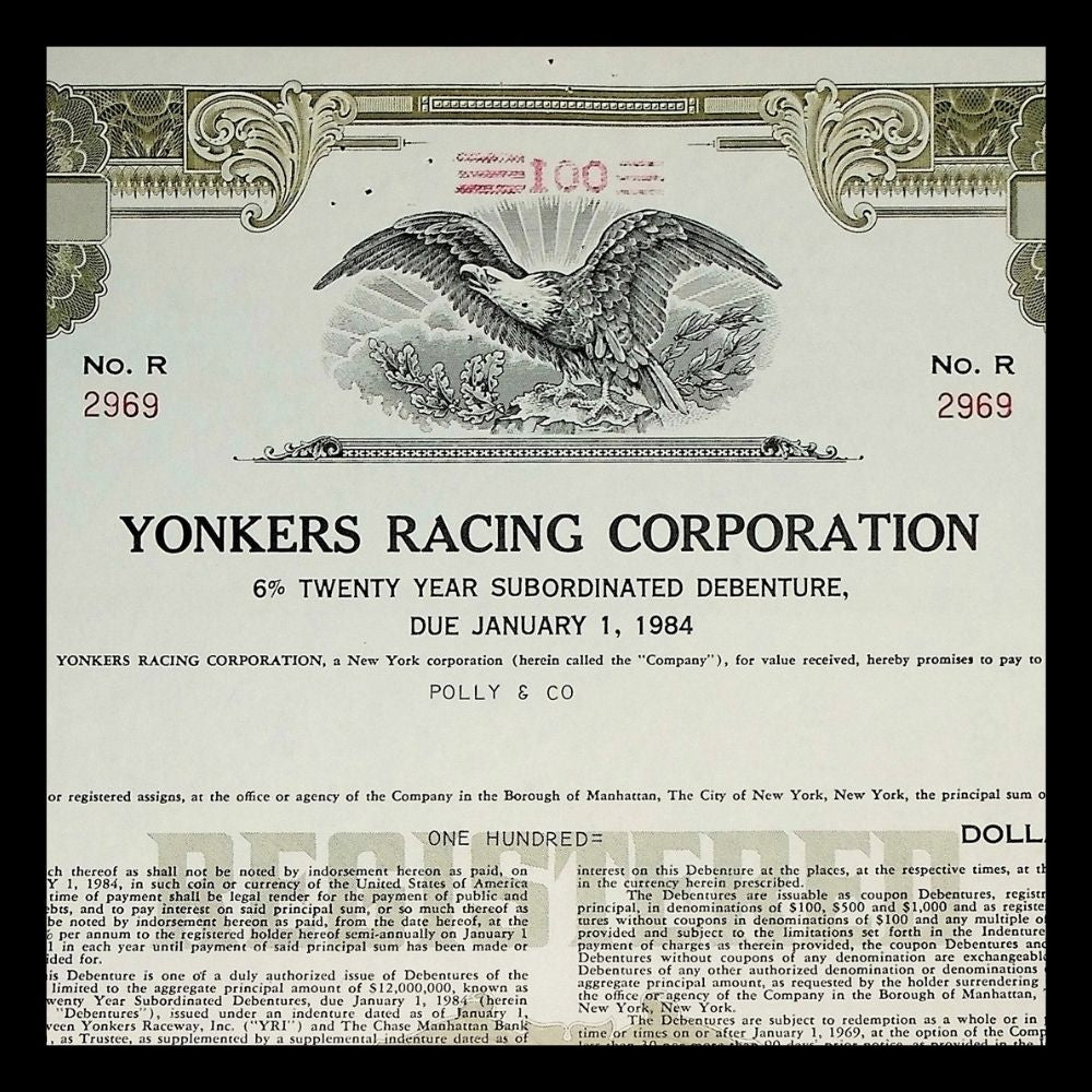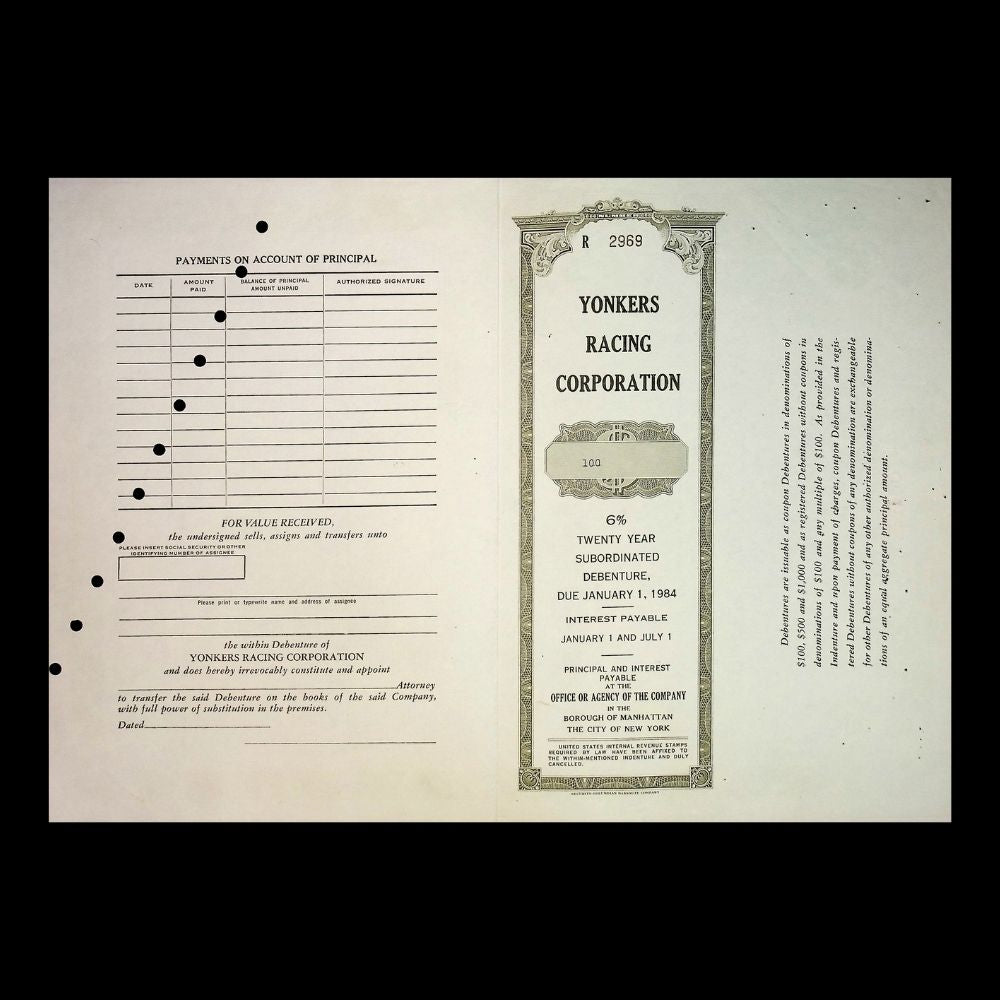 Yonkers Racing Corporation operated the renowned Yonkers Raceway, a staple of American harness racing since its founding in 1899 in Yonkers, New York. Originally opened as the Empire City Trotting Club, the venue played a key role in popularizing harness racing, particularly during the mid-20th century. The 1960s and 70s were a boom period for the raceway, prompting financial activity such as the issuance of corporate bonds like this one to support ongoing expansion and modernization efforts.