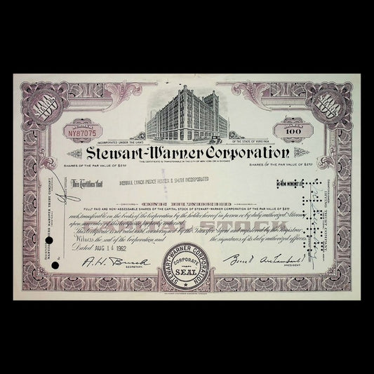 Stewart-Warner Corporation Stock Certificate from 1960s–70s