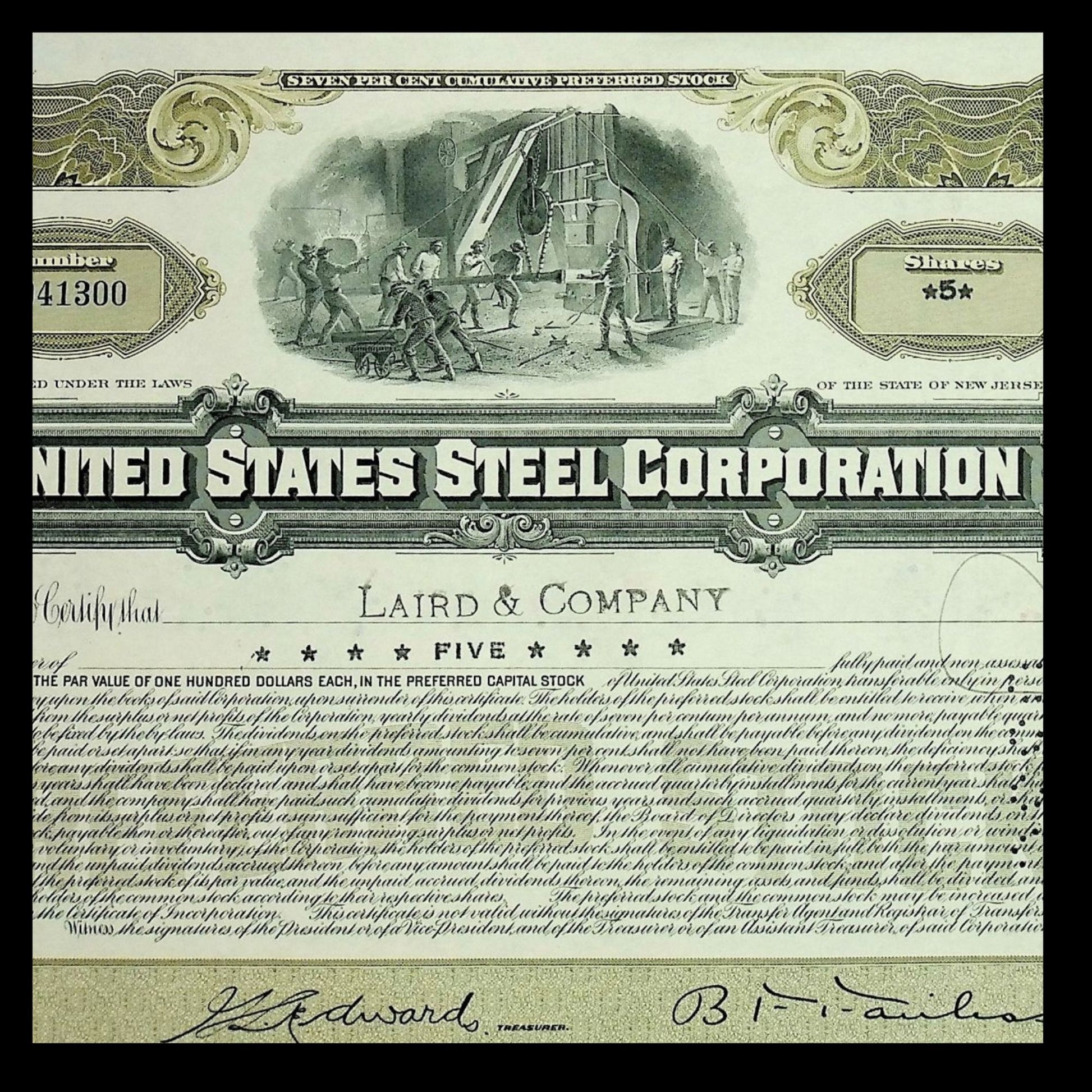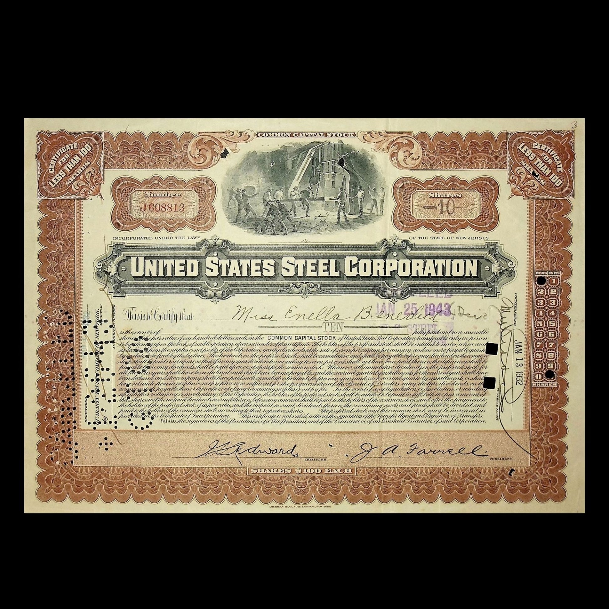 您可以选择美国钢铁公司标志性的绿色或棕色股票证书,该证书于 20 世纪 40 年代发行和作废。精美的插图描绘了工厂里的钢铁工人。